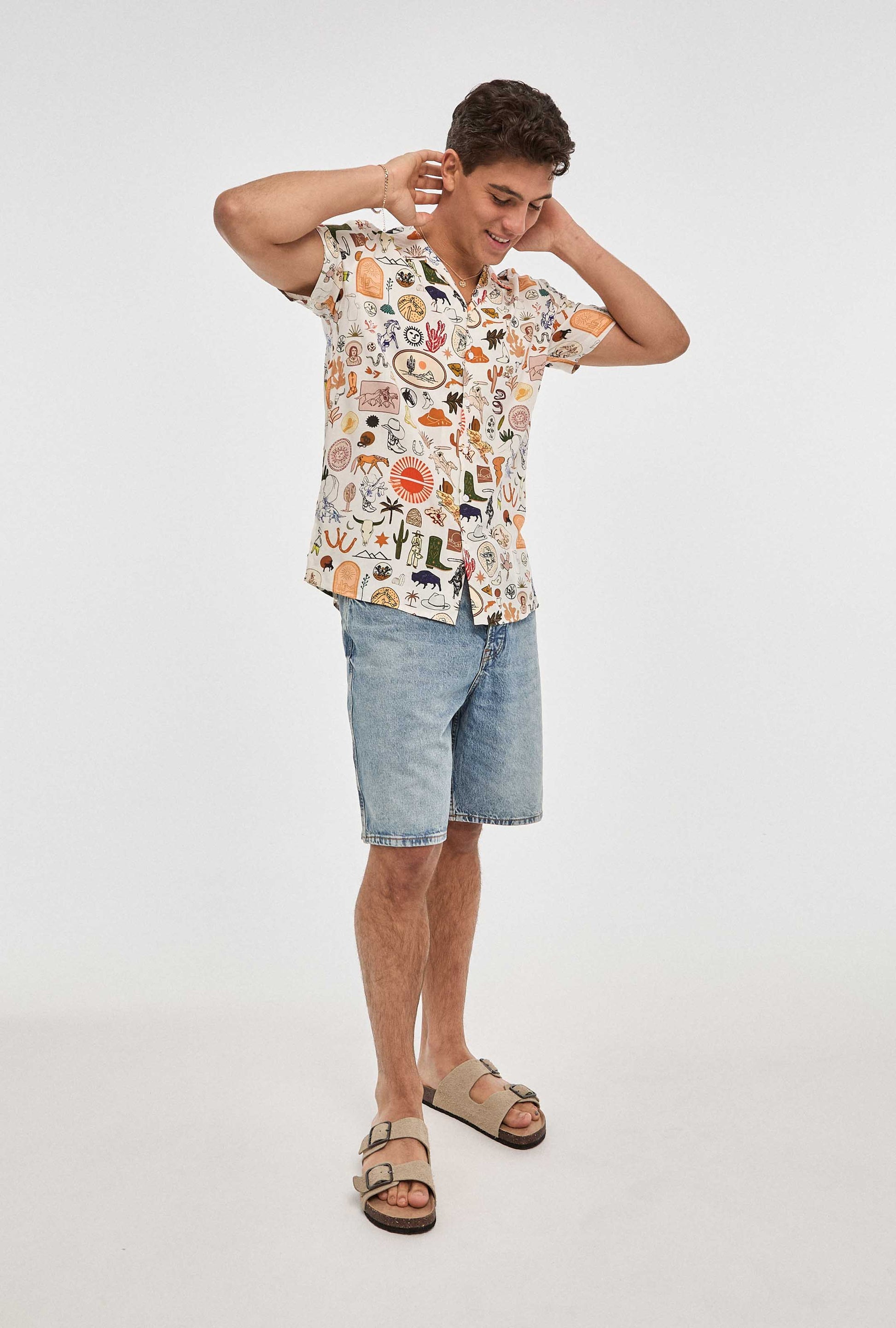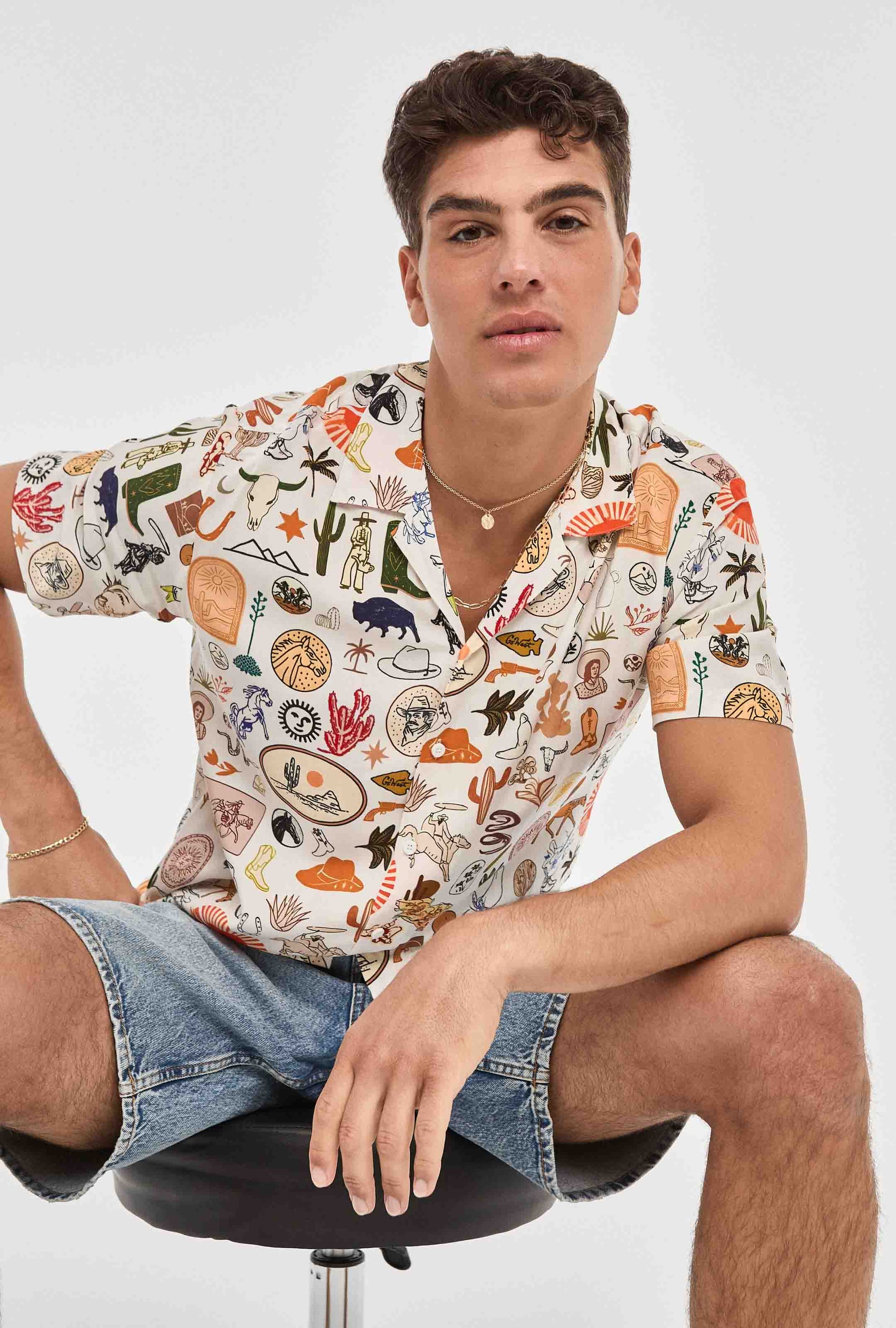 ¡Exprésate con estilo y diversión con nuestra exclusiva Camisa Hawaiana blanca de cow boy! Esta camisa, diseñada con un corte imperio y un patrón regular fit, combina la comodidad de una prenda casual con un toque de originalidad.