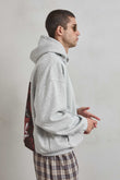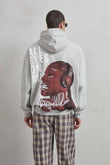 Sudadera gris jaspe oversize boxy fit con estampado delantero “BE” y gráfico trasero “ALL EYES ON ME” con rostro expresivo | Interior afelpado compuesto | Unisex
