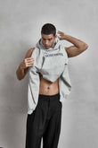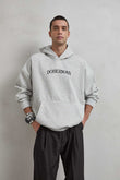 Sudadera gris jaspe oversize boxy fit con bordado delantero “DOBERMAN” y estampado trasero con texto y tres perros dóberman estilo vintage | Interior afelpado compuesto | 74.5% poliéster, 23% algodón, 2.5% spandex | Unisex